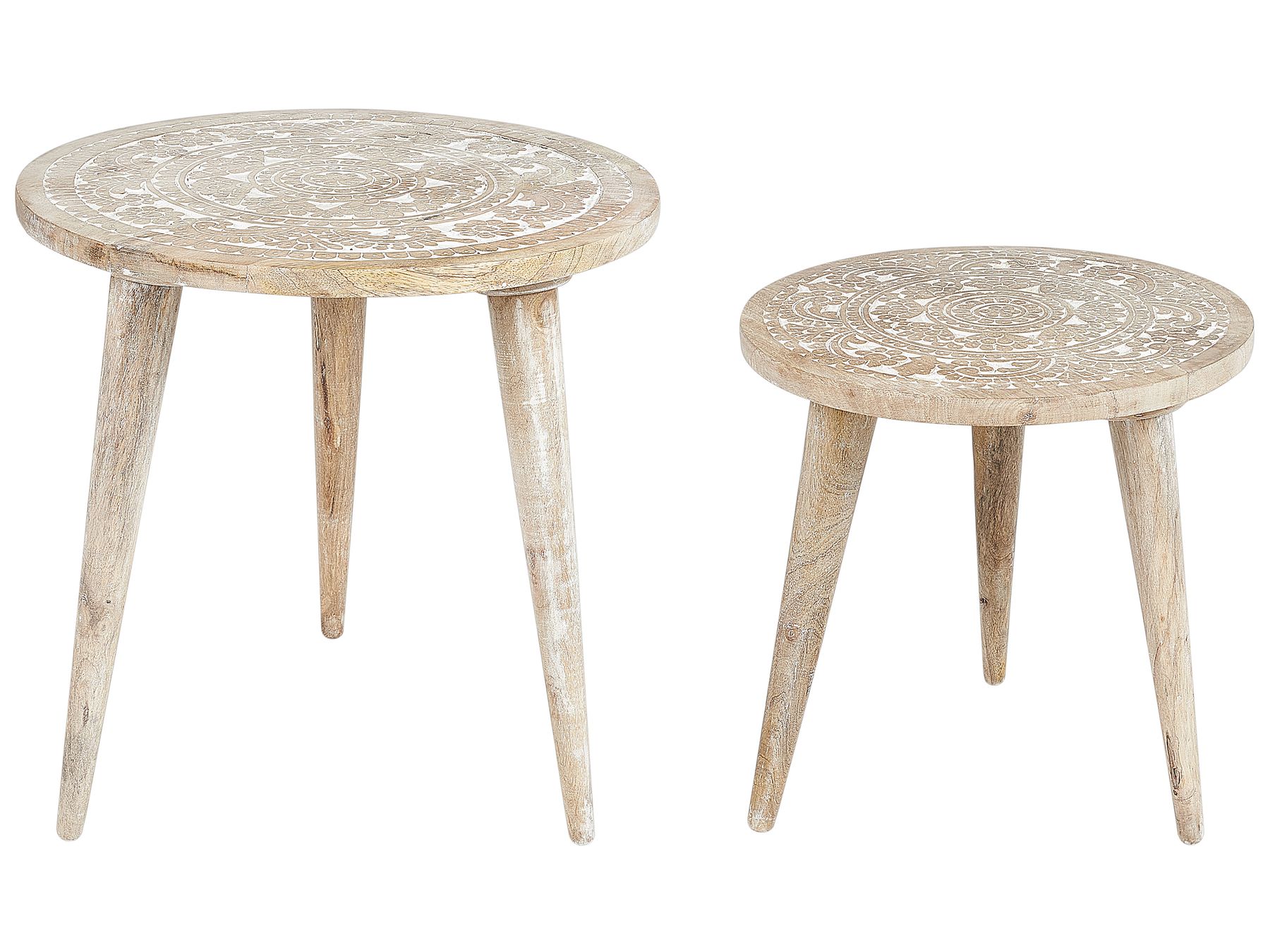 Complete your interior with this stunning set of two side tables, which will immediately catch your eye with their unique design. These pieces are not only beautiful to look at, but they are also expertly crafted by hand, ensuring that each piece is unique and of the highest quality. The natural beauty of the wood grain adds warmth, and their compact size makes them versatile for any room. The craftsmanship of the tables ensures they are built to last and withstand daily use.